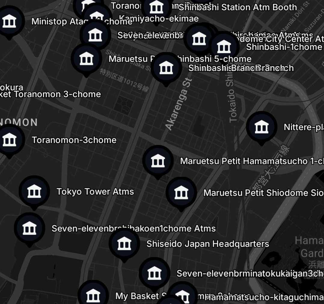 - 地図上に現在地付近で利用可能なATMがピンで表示される