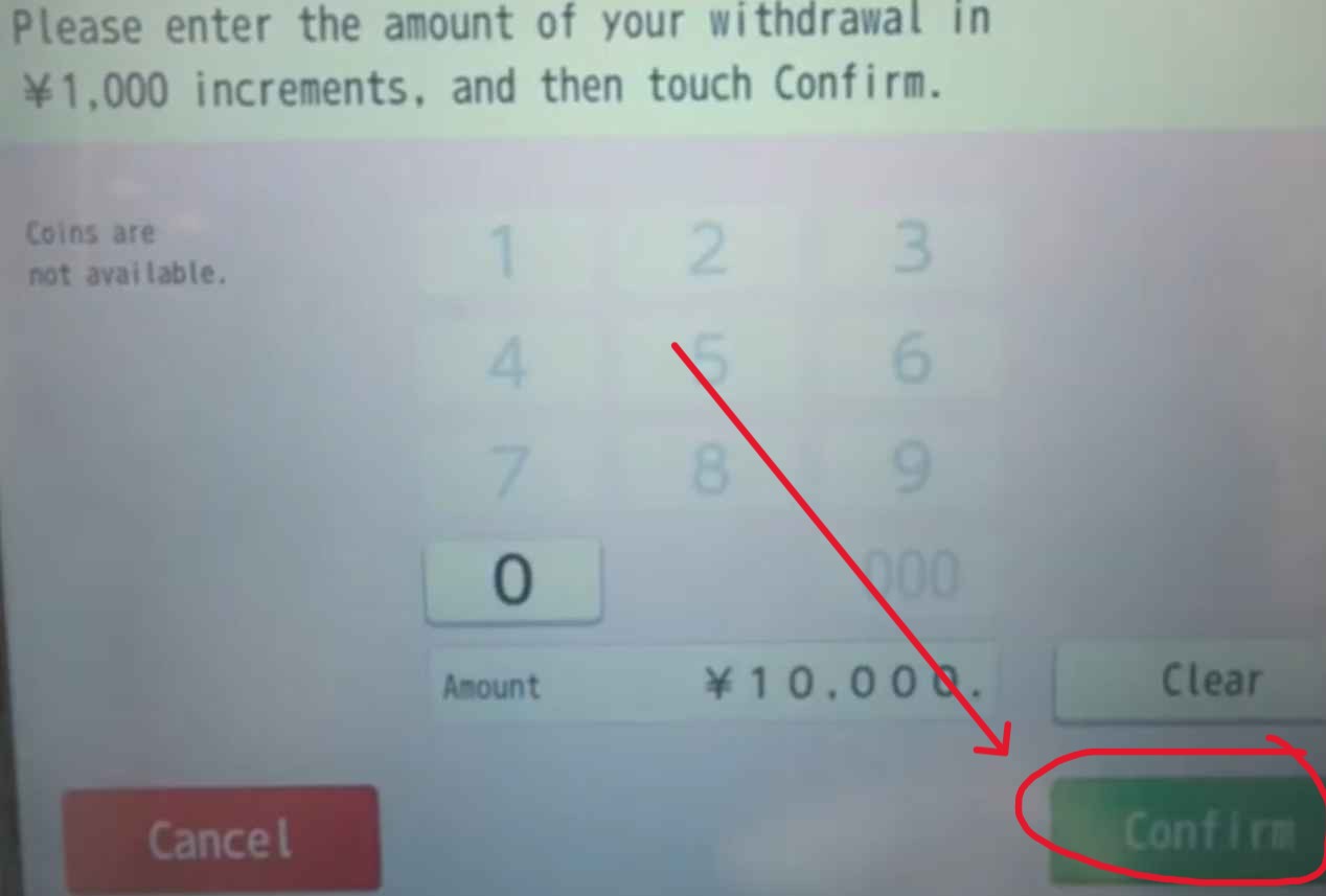 実際にイオン銀行ATMで現金を引き出す際の手順です。画面が英語表記(Overseas)になることが多いので、以下の流れを参考にしてください。
